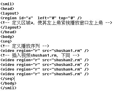 為了實現視頻的連續播放,我們要用到以下標記:與(包含若干子元素構成一個時間序列,如video)、與(與下面介紹的rigion定義播放時在播放器中的顯示區域,顯示格式等)、、