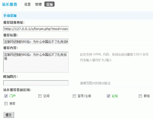 如果網站管理者想為社區就某一事件制造一個討論高潮,或者聯合商家舉辦一次搶樓、團購等活動推薦,那么“站長推薦”功能就可以派上用途。