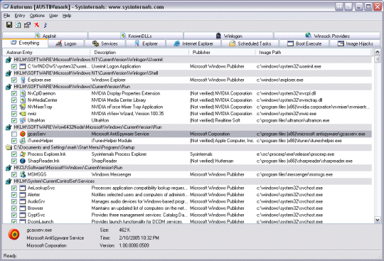 Autoruns for Windows 是 Mark Russinovich 和 Bryce Cogswell 開發的一款軟件,它能用于顯示在 Windows啟動或登錄時自動運行的程序,并且允許用戶有選擇地禁用或刪除它們,例如那些在“啟動”文件夾和注冊表相關鍵中的程序。此外,Autoruns還可以修改包括:Windows 資源管理器的 Shell 擴展(如右鍵彈出菜單)、IE瀏覽器插件(如工具欄擴展)、系統服務和設備驅動程序、計劃任務等多種不同的自啟動程序。