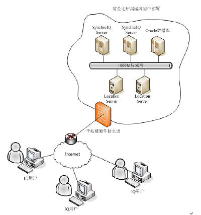 該方案采用集中式管理和部署的方式:在省廳部署IQ server集群服務(wù)器、Location Server服務(wù)器和Oracle數(shù)據(jù)庫。全省各地市、縣、派出所的用戶安裝IQ客戶端,通過Internet訪問IQ Server。