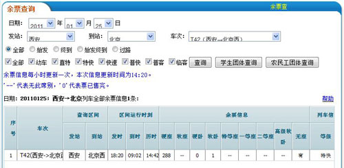 西部e網小編icech查詢了一下,輸入“1月25日西安到北京的T42車次”,查詢結果是:288張硬座,0張硬臥,1張軟臥。昨天,鐵路客戶服務中心開通試運行,旅客可上網查詢客票余額情況。鐵路部門在全國18個鐵路局(公司)所在地分別設立鐵路客戶服務中心,并采取電話語音查詢、人工在線服務和12306網站(www.12306.cn)信息查詢、客戶