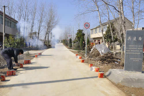 揭碑儀式上,新建的公路爆竹聲聲,一片喜氣