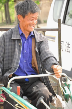 村里老農(nóng)在新路上開著拖拉機(jī)運送生產(chǎn)物資,格外開心