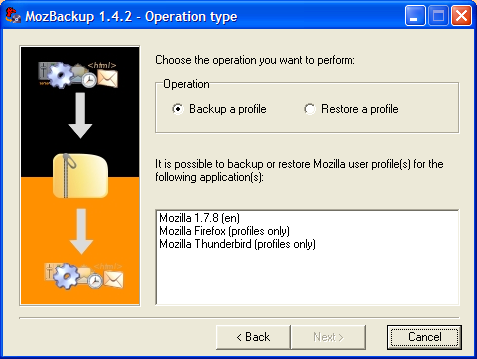MozBackup是一款能夠幫使用者備份與還原 Mozilla Firefox、Mozilla Thunderbird、Mozilla Sunbird、SeaMonkey、Flock、Mozilla Suite、Spicebird and Netscape 等設定與數據的免費工具,讓使用者不必再為了數據轉移時的備份工作感到煩惱。例如對Firefox而言,您可以將一臺機器上的擴展和設置通過MozBackup移動到數臺機器上,這對于用于經常在瀏覽器中完成工作的人來說,可以明顯減少構筑工作環境的麻煩。