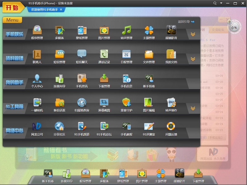 首次全面支持多種智能手機系統(tǒng),采用了統(tǒng)一的手機驅(qū)動體系結(jié)構(gòu)和安裝程序,一款軟件即可同時管理iPhone、Android、Windows Mobile、S60四個平臺的手機。