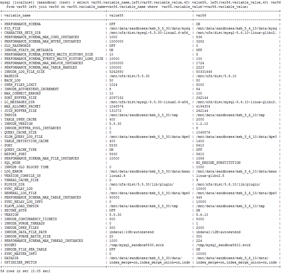 作為 MySQL 5.5 和 5.6 性能比較的一部分,我研究了下兩個版本默認(rèn)參數(shù)的差異,為了了解差異內(nèi)容,我使用如下的 SQL 語句分別在 MySQL 5.5 和 5.6 版本進行查詢,得出下表: