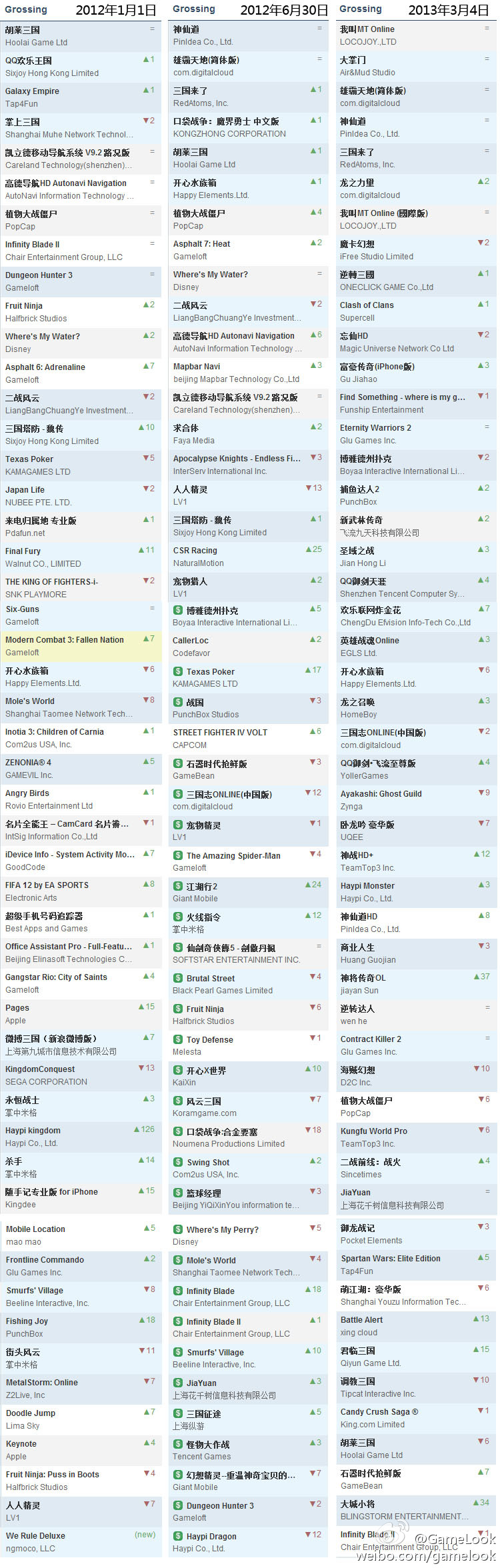 gamelook在微博發(fā)了一張圖,對(duì)比中國(guó)區(qū)Appstore收入榜TOP50 三個(gè)時(shí)間節(jié)點(diǎn)的排名情況,今天我們?cè)谖⒉┥显俅窝a(bǔ)發(fā)了美國(guó)區(qū)的情況,這張圖表十分清晰的顯示了1年多來(lái)移動(dòng)游戲市場(chǎng)的變化,引起很多業(yè)內(nèi)人士的關(guān)注。