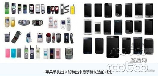 我們可以來看這樣一張圖片,本來手機制造業是個百家齊放的局面,但是蘋果出來后大家必須跟著蘋果走,學習蘋果才能獲得市場和消費者的認可,此時蘋果是行業的引領者,蘋果出什么大家就跟著做什么。