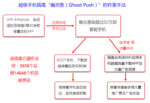 9月18日,獵豹移動安全實驗室發布緊急安全警報,一個名為“幽靈推(Ghost Push)的病毒感染了全球大量安卓手機。單單獵豹移動的統計,每日就有超過60萬臺手機中毒,預計真實受害用戶應更多。受害用戶主要集中在美國、印度、中國、墨西哥等,其中中國的云南、廣東等省受害嚴重。