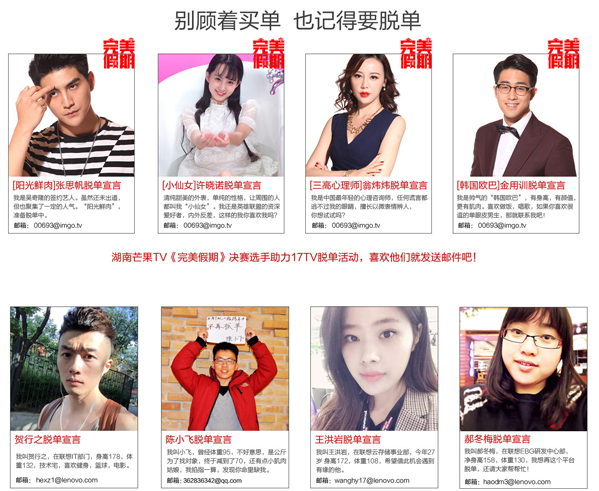 聯(lián)想17TV(https://17tv.tmall.com/ )攜手當(dāng)貝市場(chǎng)(http://www.dangbei.com/),專(zhuān)門(mén)為單身汪們舉辦的“買(mǎi)單又脫單”大型活動(dòng)正火熱進(jìn)行中,偷偷告訴你,除了從事商務(wù)、運(yùn)營(yíng)、財(cái)務(wù)、IT等職業(yè)的型男靚女之外,芒果TV《完美假期》的決賽選手們也在等著你哦!只要參與,就有可能和他們成為幸福的戀人,還將有機(jī)會(huì)贏取17TV50寸智能電視哦!