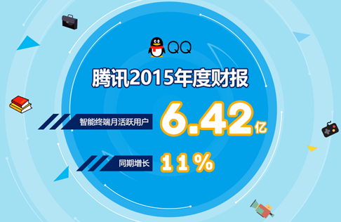 騰訊2015全年總收入為人民幣1,028.63億元(158.41億美元 ),比去年同期增長30%。QQ智能終端月活躍賬戶達到6.42億,比去年同期增長11%。QQ空間智能終端月活躍賬戶數達到5.73億,比去年同期增長6%。照片貼紙分享及相冊編輯等功能的增強帶動了用戶活躍度提升。