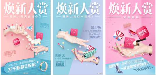 在內(nèi)容方面,主打都市白領(lǐng)女性的美麗說引入時(shí)尚媒體和時(shí)尚自媒體的內(nèi)容,在促銷的同時(shí)引領(lǐng)流行趨勢;而貼近年輕女生的蘑菇街,則融合了短視頻、互動雜志、游戲、娛樂明星等多種形式的內(nèi)容。而在買買買之外,大促活動更像是一場“時(shí)尚盛典”。