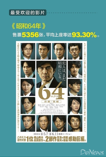 而在這之中,最讓影迷們為之瘋狂的當屬優秀的劇情片,其中來自日本的《昭和64年》受到了來自各個年齡段影迷的歡迎。該影片在影展期間共放映7場,售出5356張影票,平均上座率高達93.3%,可以說座無虛席。據了解,這部長達4小時的日本新片,本月7日剛在日本首映,而此次在上影節,該片將上、下篇連放,也就是完整特別版的世界首映,難怪受到影迷的一致追捧。