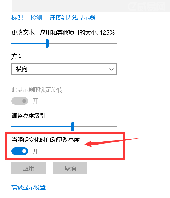 2、關閉“當照明變化時自動更改亮度”,就可以了。有些電腦這里叫做“自動調整屏幕亮度”。