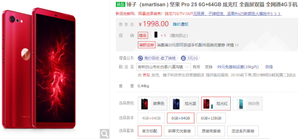 堅果Pro2S則發布于8月20日,硬件和系統方面,堅果Pro2S搭載了驍龍710處理器,6.01英寸FHD+全面屏,配備4G/6G運存+64G/128G存儲組合。運行全新的SmartisanOS6.6.5系統,新增TNT大屏幕操作系統與全新的“無限屏”功能,配備線性馬達,流暢度和性能表現都相當不錯。