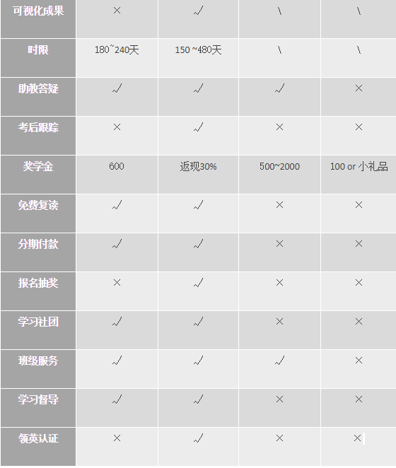 其實(shí)服務(wù)內(nèi)容看名稱便能了解個(gè)大概,考后跟蹤會(huì)對(duì)結(jié)果做出記錄并評(píng)估效果,獎(jiǎng)學(xué)金是分?jǐn)?shù)達(dá)指定范圍的獎(jiǎng)勵(lì),免費(fèi)復(fù)讀是分?jǐn)?shù)沒(méi)到范圍的福利,學(xué)習(xí)社團(tuán)就是給各位烤鴨找個(gè)大掛爐、一起探討怎么烤入味兒,班級(jí)服務(wù)就是定期提醒你的課程及考試安排,學(xué)習(xí)督導(dǎo)更進(jìn)一步、隨時(shí)用短信、QQ督促你好好學(xué)習(xí),領(lǐng)英認(rèn)證則可以把課程學(xué)習(xí)結(jié)果標(biāo)注到linked in上。