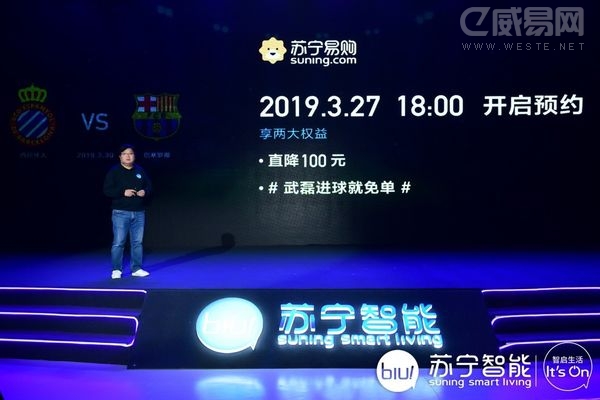 3月27日發布會當天18點起,即可在蘇寧易購參與0元預約小Biu智能耳機加泰羅尼亞藍色款,如果武磊在比賽中進球,預約用戶就有機會享受耳機免單。值得注意的是,預約時間截止到3月31日01:00, 4月1日10:00-12:00搶購10000臺免單名額。