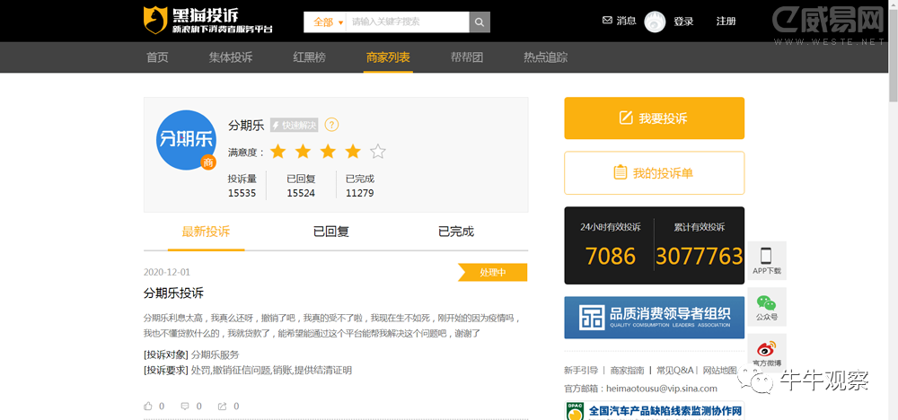 并且,消費者對分期樂的投訴卻并不少。在黑貓投訴平臺,分期樂的投訴量已高達15536人次。搜索樂花卡,共有1531條結果。搜索樂卡,共有2865條結果。
