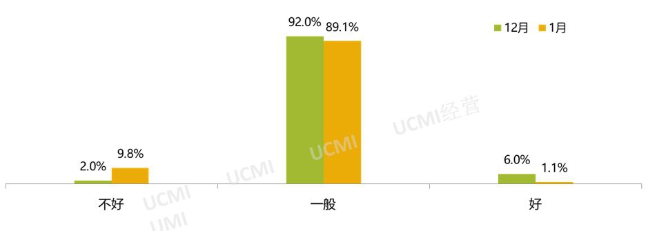 調查顯示,二手車經理人認為1月份的經營狀況不好,認為經營狀況“好”的經理人比例為1.1%,認為“不好”的比例為9.8%。