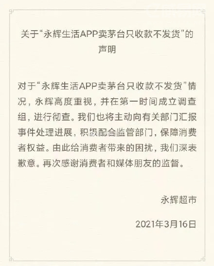 針對“永輝生活APP賣茅臺只收款不發貨”的情況,永輝超市發布聲明回應稱,永輝高度重視,并在第一時間成立調查組,進行徹查。