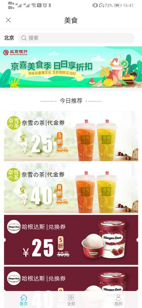 點擊進入北京,除了上一層頁面的功能點外,約“惠”美食,嗨吃一夏的頁面成功吸引了吃貨小編,點擊進入發(fā)現(xiàn)是奈雪的茶、哈根達斯、幸福西餅、巴黎貝甜、麥當勞、必勝客、真功夫、云海肴共8家店的代金券,其中分五折券和八折券,五折券每周三和指定節(jié)日上午十點開搶,每種限量100張,每個用戶限領(lǐng)1張;八折券則是每日每個用戶限購3張,不限時,吃美食愛好者們沖呀。