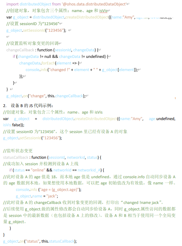 分布式數(shù)據(jù)對象,最重要的功能就是對象之間的數(shù)據(jù)同步?尚沤M網內的設備可以在本地創(chuàng)建分布式數(shù)據(jù)對象,并設置sessionID。不同設備上的分布式數(shù)據(jù)對象,通過設置相同的sessionID,建立對象之間的同步關系。