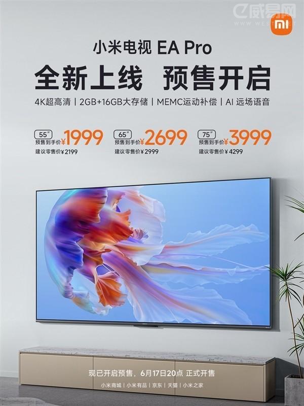 小米電視 EA Pro 的售價為:55 英寸:原價 2199 元,首發(fā)價 1999 元;65 英寸:原價 2999 元,首發(fā)價 2699 元;75 英寸:原價 4299 元,首發(fā)價 3999 元。