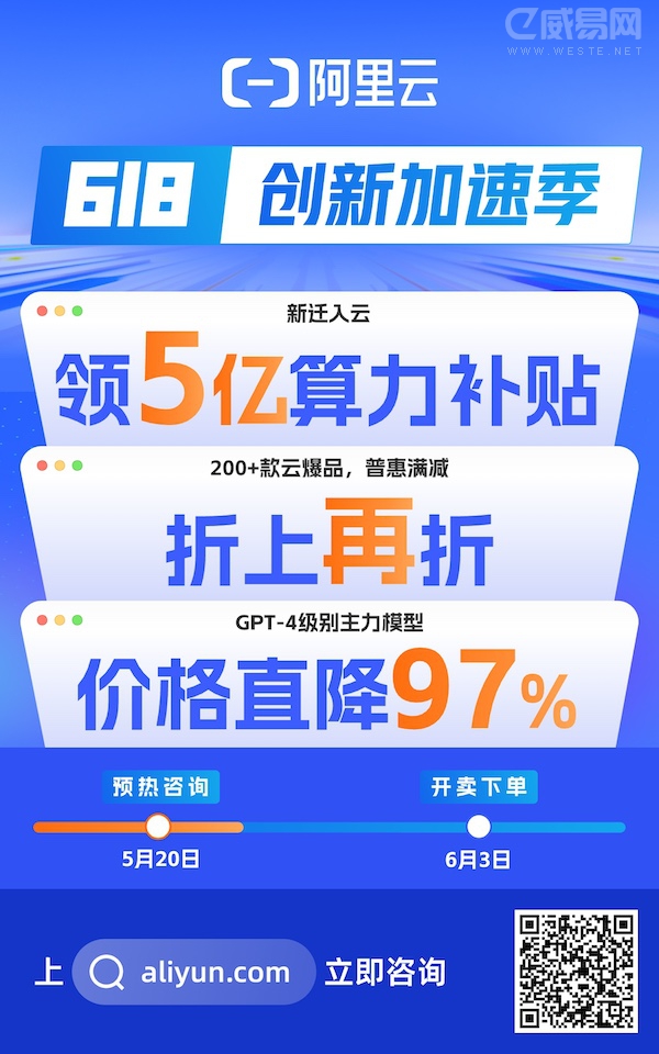 繼阿里云通義千問主力模型降價(jià)97%后,上云優(yōu)惠接踵而至!5月22日,投入最大的一屆阿里云618創(chuàng)新加速季全面開啟,阿里云首次推出5億元加速上云算力補(bǔ)貼,企業(yè)IT業(yè)務(wù)新遷至阿里云即可減巨幅成本,補(bǔ)貼上不封頂。同時(shí),阿里云準(zhǔn)備了滿減券,所有用戶均可登錄阿里云官網(wǎng)領(lǐng)取,滿減券可疊加享200余款爆品折上折,GPU云服務(wù)器等AI算力及AI產(chǎn)品同樣適用。