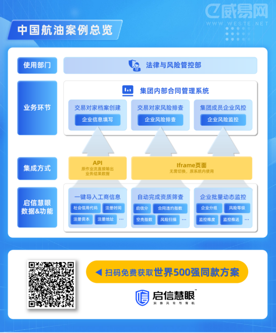 目前,啟信慧眼目前已經與中國航油集團(以下簡稱“中國航油”)等多家央國企建立了合作關系。中國航油將啟信慧眼的數據與部分功能以插件形式集成到集團內部合同管理系統中,實現了多項風控能力的提升。通過這一合作,中國航油實現了交易對家創建效率的提升、準入排查提效和虛假貿易規避,以及對企業監控的增強。