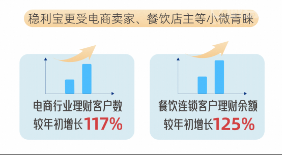 其中,電商賣家、餐飲店主等小微更偏愛穩利寶。數據顯示,電商行業理財客戶數較年初增長117%,而餐飲連鎖客戶理財余額則較年初增長125%。
