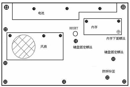 本子的鍵盤忙了半天,終于拆了下來。不過想把鍵盤整個拿走,還必須把整個本子的上蓋取下來,這需要拆除電池下面的三個小螺絲,電池兩側的兩個長螺線,以及其余七個螺絲。在內存盒里面還有一個螺絲,需要注意。螺絲分布見下圖。