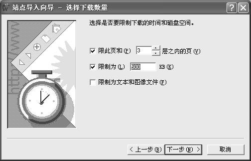 勾選“限此頁和XX層之內的頁”復選項,并輸入需要導入層次的數目。這個參數限制FrontPage自動下載的范圍,建議大家把搜索的層數限制在3層以內,因為網頁的連接通常都比較多,如果下載的層數太多,就會造成過多的無效下載,反而浪費了帶寬和資源。當然,如果不計較通信費用,可以試試多搜索幾層。設置后勾選下面的“限此為XXKB”復選項,并輸入導入文件需占用的硬盤空間。這個參數我們可以根據自己的需要進行設置,單位是KB。如果你只想導入文本和圖像文件,而不包含任何組件、Java小程序和其他相關文件,則勾選“限制于文本和圖像文件”復選框即可。