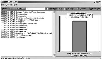 SpeedText可以用來測試你的電腦連接某網站或服務器的速度,結果會以柱狀圖的形式表示。該軟件的使用方法很簡單:在軟件主界面的“Server”欄填寫網址,回車即可得到測試結果(如圖1:用SpeedText測試連接新浪網的速度。如果想將該結果與標準速度進行比較,可以執行“Compare”菜單,并從中選擇一個標準)。