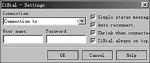 第二步到http://service.seeder.net/dialup/CiDial23.exe下載一款名為CiDial的免費小軟件。安裝該軟件并運行,單擊“File→Settings”菜單,在“Connection”下拉列表框中選擇RASPPPoE在撥號網絡中的名稱,在“User name:”處填寫你的上網賬號,在“Password:”處輸入密碼,單擊“OK”按鈕(如圖3:CiDial是款小巧免費的輔助撥號軟件)。