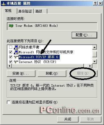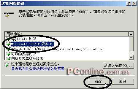 4. 在選擇網(wǎng)絡協(xié)議對話框中,選中Microsoft TCP/IP 版本 6,選確認(如圖3)