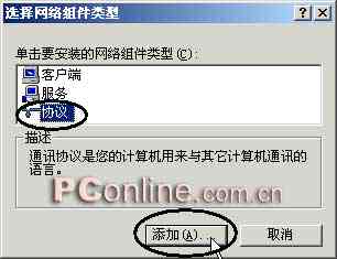 3. 在選擇網(wǎng)絡組件類型對話框中,選擇協(xié)議,添加(如圖2)