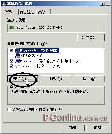 2. 選中一個本地連接,打開屬性頁,選擇安裝(如圖1)