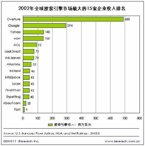 據(jù)U.S. Bancorp Piper Jaffray發(fā)布的搜索引擎市場(chǎng)研究報(bào)告表明,2002全球搜索引擎市場(chǎng)總收入為17.99億美元。其中前收入前四位依次為Overture、Google、Yahoo、MSN Search。Google、Yahoo、MSN Search的收入排名與瀏覽量排名形成正比。搜索經(jīng)濟(jì)正進(jìn)入高增長(zhǎng)年代,預(yù)計(jì)2003年全球收費(fèi)搜索服務(wù)市場(chǎng)的規(guī)模可望達(dá)到20億美元,這個(gè)數(shù)字接近網(wǎng)絡(luò)廣告市場(chǎng)的25%。