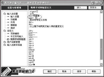 首先,打開紫光拼音輸入法3.0的屬性設置界面,在“設置與管理項” 中選擇“特殊字詞和短語”。接下來我們便可以自定義快捷輸入命令了。自定義詞匯格式為:字母組合=符號或漢字短語。比如:zxc=周星馳。如圖所示。