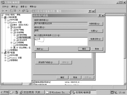 3.在“組策略”窗口的右邊選擇“從遠端系統(tǒng)強制關(guān)機”。在彈出的對話框中顯示目前只有“Administrators”組的成員才有權(quán)遠程關(guān)機;單擊對話框下方的“添加用戶或組”按鈕,然后在新彈出的對話框中輸入“guest”,再單擊“確定”。