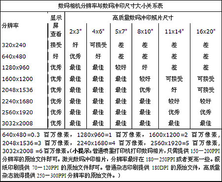 數(shù)碼相機分辨率與數(shù)碼沖印尺寸大小關(guān)系表