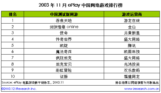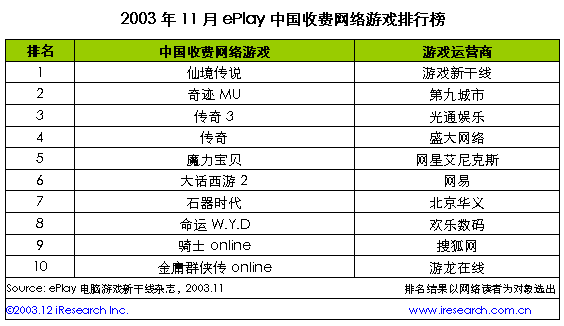 收費游戲排名的前十款游戲全是MMORPG(大型角色扮演類游戲)。代理運營的韓國游戲占了6款并包攬了前4名。