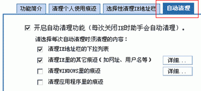 “不會吧,老大,每次都需要偶自己去清理?有沒有人性啊。”“你看,你總是這么心急,我話還說完,你就又把唾沫吐我臉上了,這已經(jīng)是第784次了...。你可以設(shè)置在每次關(guān)閉IE(或者關(guān)機)時,讓上網(wǎng)助手自動清理這些內(nèi)容。當然這個操作只需要設(shè)置一次,長期有效。”