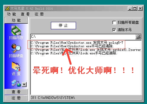 無論是官方下的還是破解版本的新版WINDOWS優化大師都存在木馬!目前最新版本的WINDOWS優化大師是5.72或者是5.71,放置木馬的原因很可能是作者在不斷盜版后做了手腳,各位如果你不相信的話,可以用木馬克星專門殺WINDOWS優化大師5.71或5.72所在的安裝目錄,提示有木馬存在!!小心!!