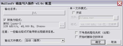 2.右擊Winamp主窗口的“選項(xiàng)→參數(shù)設(shè)置”,在“Winamp參數(shù)設(shè)置”對(duì)話框中選擇:“插件→輸出→NullSoft磁盤(pán)寫(xiě)入插件”,單擊“配置”按鈕,在其對(duì)話框中選擇壓縮后的文件輸出目錄和壓縮時(shí)所使用的參數(shù)。(注意:如果開(kāi)啟“單一文件模式”的話,則會(huì)將播放列表中的所有音樂(lè)文件都?jí)嚎s并保存在一個(gè)MP3文件中。)