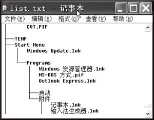 DOS會(huì)自動(dòng)在當(dāng)前目錄下生成一個(gè)名為list.txt的文件,打開這個(gè)文件看看,你會(huì)發(fā)現(xiàn)這個(gè)文件以樹狀結(jié)構(gòu)將硬盤分區(qū)或相應(yīng)目錄下所有的文件和子目錄都列了出來,脈絡(luò)清晰,讓人一目了然,如圖2所示。