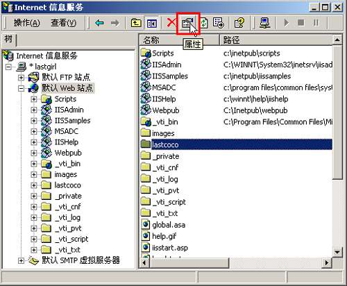 步驟一:單擊“開始”>“設置”>“控制面板”,雙擊進入到“管理工具”中,打開“Internet 服務管理器”,展開左窗口的“默認Web站點”,然后在其所展開的目錄中選中我們想對其進行加密的目錄(如:lastcoco),然后單擊“屬性”按鈕,打開“lastcoco屬性”對話框(如圖1)。
