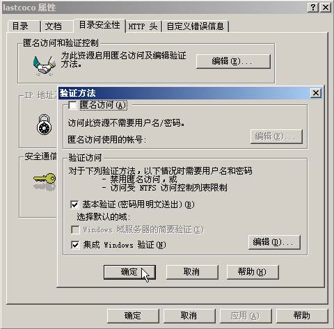 步驟二:選擇“lastcoco屬性”對話框中“目錄安全性”標簽,單擊“匿名訪問及驗證控件”域中的“編輯”按鈕。這時會彈出“驗證方法”對話框,在“驗證方法”對話框中,取消“允許匿名訪問”選項前面的勾選,然后勾選“基本驗證(密碼用明文送出)”選項,最后單擊“確定”按鈕退出(如圖2)。