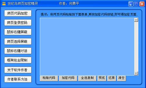 下載雙擊打開這只小鳥,只見XP風格的界面跳到眼前,左邊豎著一排是加密選項按鈕,分別是“網頁代碼加密”、“網頁登錄密碼”“鼠標右鍵屏蔽”、“網頁選擇屏蔽”、“鼠標右鍵對話”、“框架包含限制”這些。右邊則是網頁代碼加密對話框,在這個對話框中進行對網頁的加密,而且在對話框上方給出每個選項的解釋,在對話框下方則是建議。