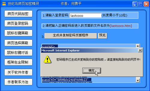 2. 在“請輸入登錄密碼”的輸入框中輸入長度小于10位的密碼,然后單擊“生成并復制密碼頁面程序”按鈕,這時軟件會自動在下方的javascript代碼中加入你輸入的登錄密碼做為驗證信息,并將這段代碼復制到你的剪貼版中(如圖6)。